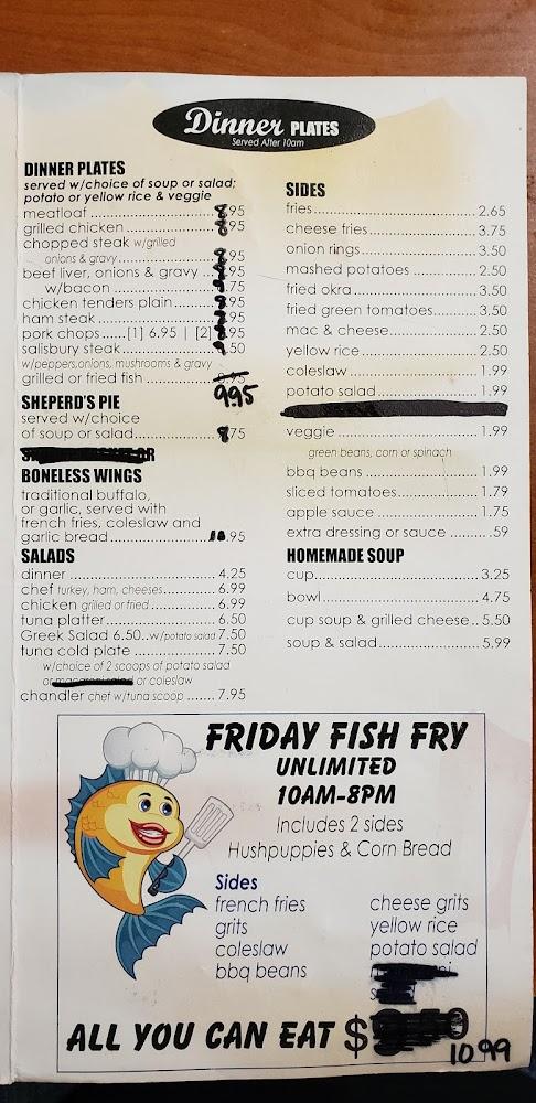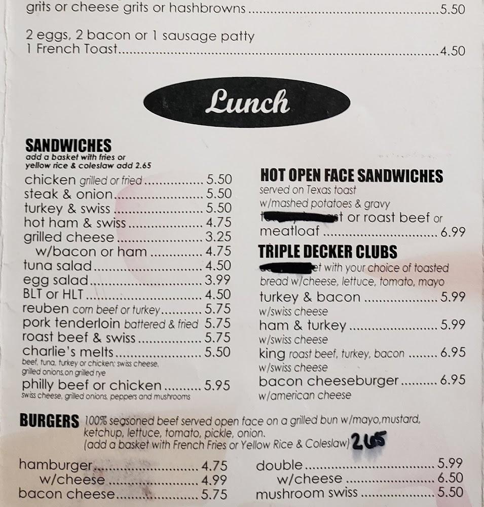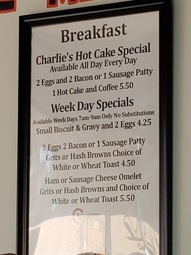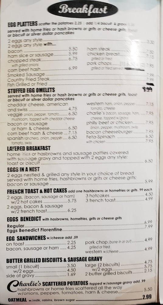 Charlie's Family Restaurant offers a diverse menu focused on comfort food. Breakfast dishes dominate the menu, ensuring every diner can find a favorite. Enjoy everything from hearty omelets to classic fried fish on Fridays.